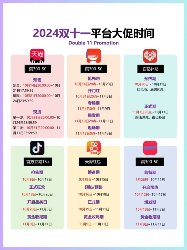 今年双 11 显著特点之一是时间提前且战线大幅拉长。抖音于 10 月 8 日入局,小红书在 10 月 12 日启动,淘宝也于 10 月 14 日加入。