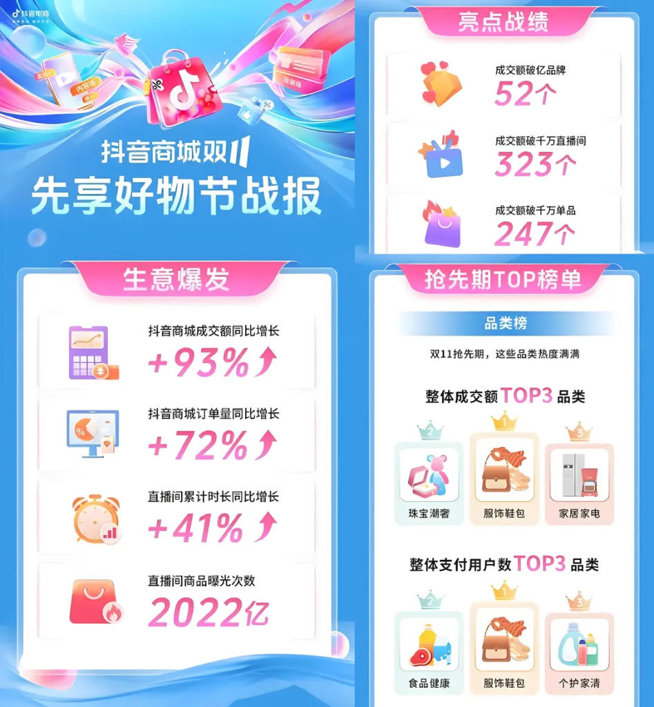 抖音平台数据显示,2024 年双 11 首日,抖音电商超 9000 个品牌交易额翻倍,李宁等国货品牌成交额狂飙 622%。双 11 好物节抢先期累计有 52 个品牌成交额破亿元。